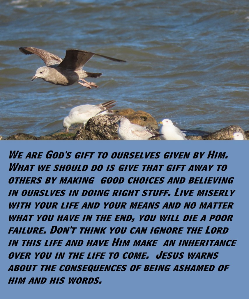We are God’s gift to ourselves given by Him. What we should do is give that gift away to others by making good choices and believing in ourslves in doing right stuff. Live miserly with your life and your means and no matter what you have in the end, you will die a poor failure. Don’t think you can ignore the Lord in this life and have Him make an inheritance over you in the life to come. Jesus warns about the consequences of being ashamed of him and his words.