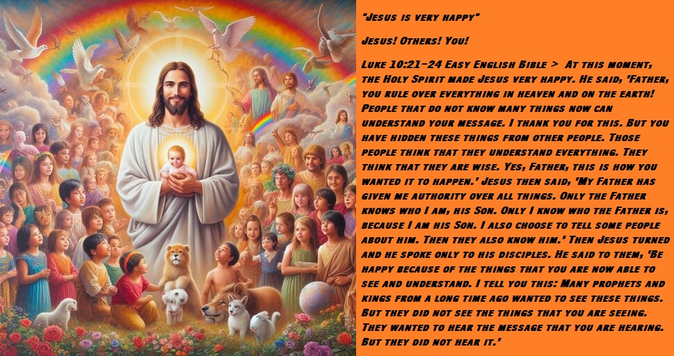 Luke 10:21-24 Easy English Bible > At this moment, the Holy Spirit made Jesus very happy. He said, ‘Father, you rule over everything in heaven and on the earth! People who do not know many things now can understand your message. I thank you for this. But you have hidden these things from other people. Those people think that they understand everything. They think that they are wise. Yes, Father, this is how you wanted it to happen.’ Jesus then said, ‘My Father has given me authority over all things. Only the Father knows who I am, his Son. Only I know who the Father is because I am his Son. I also choose to tell some people about him. Then they also know him.’ Then Jesus turned and he spoke only to his disciples. He said to them, ‘Be happy because of the things that you are now able to see and understand. I tell you this: Many prophets and kings from a long time ago wanted to see these things. But they did not see the things that you are seeing. They wanted to hear the message that you are hearing. But they did not hear it.’