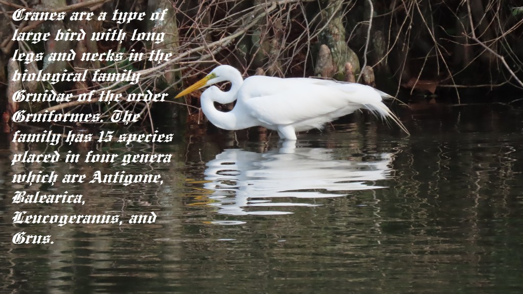 Cranes are a type of large bird with long legs and necks in the biological family Gruidae of the order Gruiformes. The family has 15 species placed in four genera which are Antigone, Balearica, Leucogeranus, and Grus. They are large birds with long necks and legs, a tapering form, and long secondary feathers on the wing that project over the tail. Most species have muted gray or white plumages, marked with black, and red bare patches on the face, but the crowned cranes of the genus Balearica have vibrantly-coloured wings and golden “crowns” of feathers. Cranes fly with their necks extended outwards instead of bent into an S-shape and their long legs outstretched. Cranes are carnivores and will eat a variety of animals, including snakes. They typically prey on small snakes, such as garter snakes and blind snakes, but will also eat larger snakes, such as pythons and boas. Cranes will eat just about anything, including seeds, grain, berries, insects, worms, mice, small birds, snakes, lizards, frogs, and crayfish.