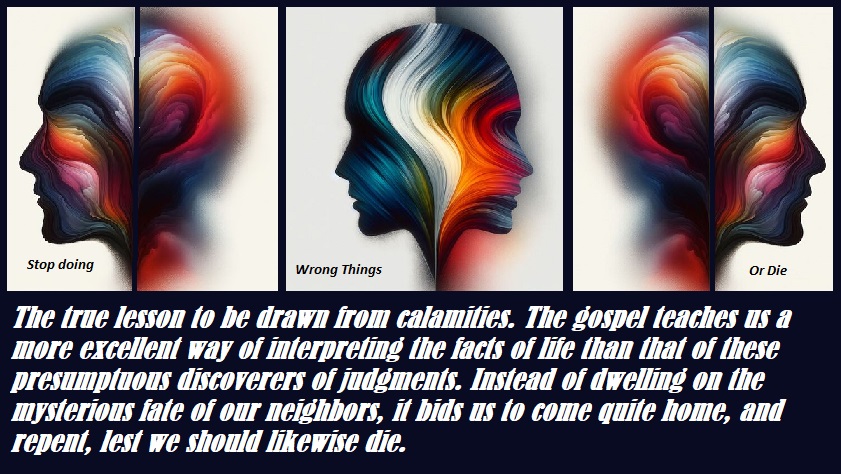 The true lesson to be drawn from calamities. The gospel teaches us a more excellent way of interpreting the facts of life than that of these arrogant discoverers of judgments. Instead of dwelling on the mysterious fate of our neighbors, it bids us to come quite home, and repent, lest we should likewise die.