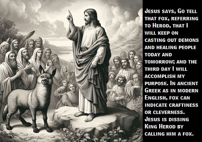 Jesus says, “Go tell that fox,” referring to Herod, “that I will keep on casting out demons and healing people today and tomorrow; and on the third day I will accomplish my purpose”. In ancient Greek as in modern English, “fox” can indicate craftiness or cleverness. Jesus is dissing King Herod by calling him a fox.