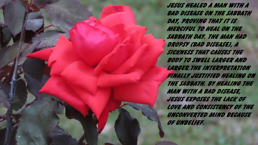 Jesus healed a man with a bad disease on the Sabbath day, proving that it is merciful to heal on the Sabbath day. The man had dropsy (bad disease), a sickness that causes the body to swell larger and larger. The interpretation finally justified healing on the Sabbath. By healing the man with a bad disease, Jesus exposes the lack of love and consistency of the unconverted mind because of unbelief.