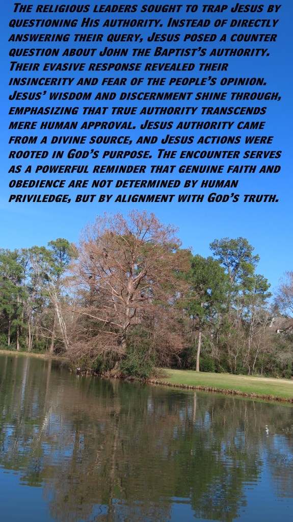 The religious leaders sought to trap Jesus by questioning His authority. Instead of directly answering their query, Jesus posed a counter question about John the Baptist’s authority. Their evasive response revealed their insincerity and fear of the people’s opinion. Jesus’ wisdom and discernment shine through, emphasizing that true authority transcends mere human approval. Jesus’ authority came from a divine source, and Jesus’ actions were rooted in God’s purpose. The encounter serves as a powerful reminder that genuine faith and obedience are not determined by human privilege, but by alignment with God’s truth.