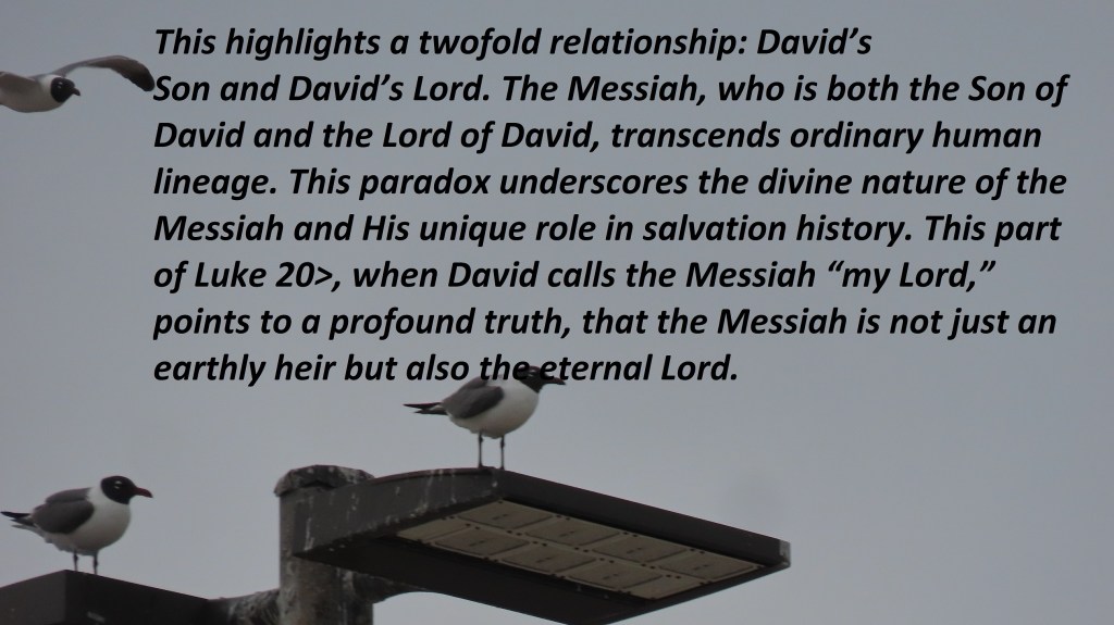This highlights a twofold relationship: David’s Son and David’s Lord. The Messiah, who is both the Son of David and the Lord of David, transcends ordinary human lineage. This paradox underscores the divine nature of the Messiah and His unique role in salvation history. This part of Luke 20>, when David calls the Messiah “my Lord,” points to a profound truth, that the Messiah is not just an earthly heir but also the eternal Lord.