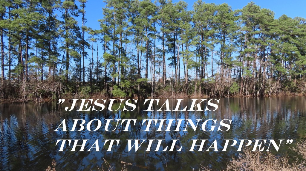 It reads in Luke 21:5-38 Easy English Bible> Some of Jesus’ disciples were talking about the temple. They spoke about the many beautiful stones in the walls. They also spoke about the many gifts to God that people had put there. Jesus said to them, ‘You can see all these beautiful things now. But a day is coming when enemies will completely destroy it all. Not even one stone will remain on top of another stone.’ ‘Teacher,’ they asked, ‘When will all these things happen? What will show us that they will soon happen?’ Jesus replied. ‘Be careful! Some people will tell you things that are not true. Do not believe them. Many people will say that they have come on my behalf. They will say, “I am the Messiah.” They will say, “Now is the time!” Do not agree with those people. You will hear about wars and people fighting each other. Do not be afraid. Those things must happen first, but the end of everything will not happen immediately.’ Jesus then said to them, ‘People from one country will attack the people from another country. Kings and their armies will fight against other kings and their armies. The ground will shake, so that people will be afraid. In many different places, people will be hungry, with no food. Diseases will go from one person to another. Many people will die. Things will also happen in the sky that will frighten people. But before all those things happen, people will take hold of you. They will do bad things to you and give you pain. They will take you to the leaders in their meeting places and they will keep you in prisons. They will make you stand in front of kings and rulers. All this will happen because you are my disciples. This will be the time to tell them the good news about me. So prepare your mind. You must decide not to think about how to answer the questions of kings and rulers. Wait until that time comes. I will give you the right words to speak at that time. I will help you to be wise. The people who are against you will not be able to argue with you. They will just be quiet. Even your parents and other people in your family will take hold of you. They will make you stand in front of kings and rulers. They will even kill some of you. Everybody will hate you because you are my disciples. But your life will be safe with me. You will not lose even one hair from your head. Yes, you will have a true life, if you remain strong. One day you will see Jerusalem with armies all around it. Then you will know that enemies will soon destroy that city. People in Judea must then run away to the hills to hide. People who are inside the city must leave it. People who are outside in the fields must not go back into the city. This is when God will punish Israel’s people. Then all the things will happened that his servants wrote about in the Bible. That will be a very bad time for women who are soon to have a baby! It will also be a bad time for those women who have little babies! Yes, very bad things will happen to all the people of this country. God will be very angry with the people who live here. At that time, enemies would fight God’s people and kill many of them in war. They will take some of them away as prisoners to live in all the other countries. They will not be free to return home. People who are not Jews will destroy Jerusalem. They will rule here until it is time for them to stop.’ ‘You will see strange things happen to the sun and to the moon and to the stars. Down on earth, things that happen will make people in many countries very afraid. The sea will move up and down and make a lot of noise. There will be great storms. These things will frighten people because they do not understand them. The powerful things in the sky will shake. People will be very afraid about what will happen next in the world. They will become very weak and fall to the ground. Then they will see the Son of Man. He will come in a cloud. He will have great power and bright glory. When these things begin to happen, stand up. And look up, because God will then save you very soon.’Then Jesus told them a story to explain this future time. He said, ‘Think about fig trees and other trees as well. When you see new leaves on a tree, you know that summer will come soon. Nobody needs to tell you that. In the same way, you will see these strange things happening. Then you will know that God will soon begin to rule in his kingdom. I tell you this: The people who are alive now will not all die until all these things happen. One day, the earth and the sky will have an end. But my words will be there forever. But be careful, and watch how you live. Do not eat or drink too much. Do not waste your time like that. Do not waste time by having troubles in your mind about your life. If you do, that day will surprise you. It will come when you are not looking. It will surprise everyone who lives on all the earth. So watch it all the time! Continue to pray that you will be strong. Then you will be safe through all these things! You will stand in front of the Son of Man and you will not be afraid.’ Every day Jesus was teaching people in the temple. Each night he went out of the city and stayed on the hill that is called the Mount of Olives. Each morning he returned to the temple. All the people were going there early in the morning to hear him.