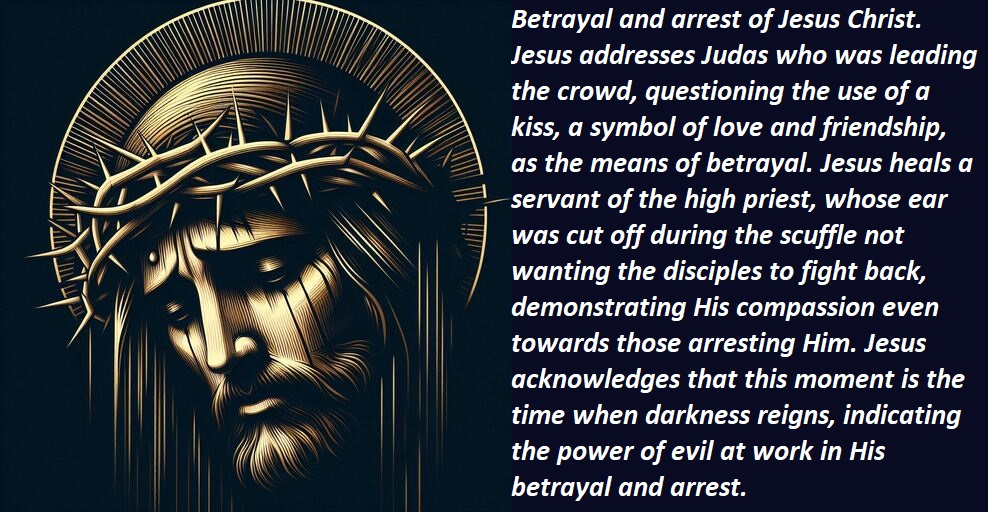 Betrayal and arrest of Jesus Christ. Jesus addresses Judas who was leading the crowd, questioning the use of a kiss, a symbol of love and friendship, as the means of betrayal. Jesus heals a servant of the high priest, whose ear was cut off during the scuffle not wanting the disciples to fight back, demonstrating His compassion even towards those arresting Him. Jesus acknowledges that this moment is the time when darkness reigns, indicating the power of evil at work in His betrayal and arrest.