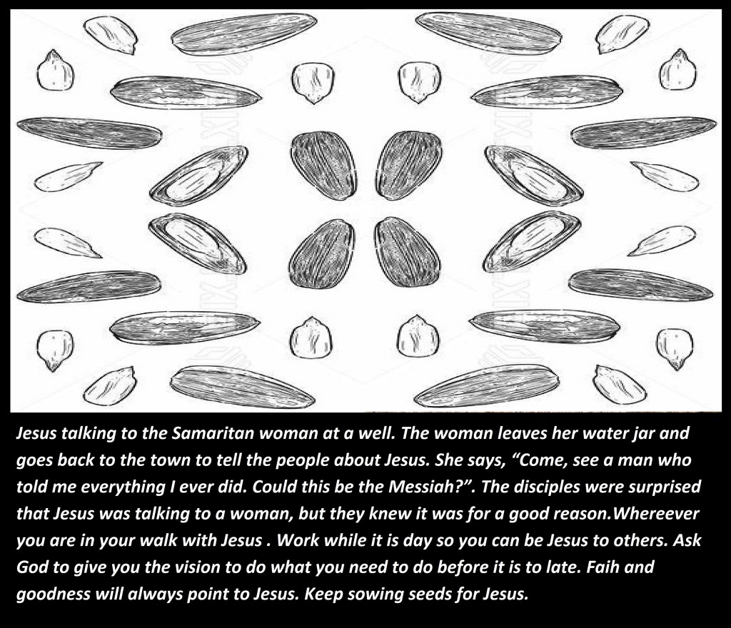 Jesus talking to the Samaritan woman at a well. The woman leaves her water jar and goes back to the town to tell the people about Jesus. She says, “Come, see a man who told me everything I ever did. Could this be the Messiah?”. The disciples were surprised that Jesus was talking to a woman, but they knew it was for a good reason. Wherever you are in your walk with Jesus. Work while it is day so you can be Jesus to others. Ask God to give you the vision to do what you need to do before it is too late. Faith and goodness will always point to Jesus. Keep sowing seeds for Jesus.