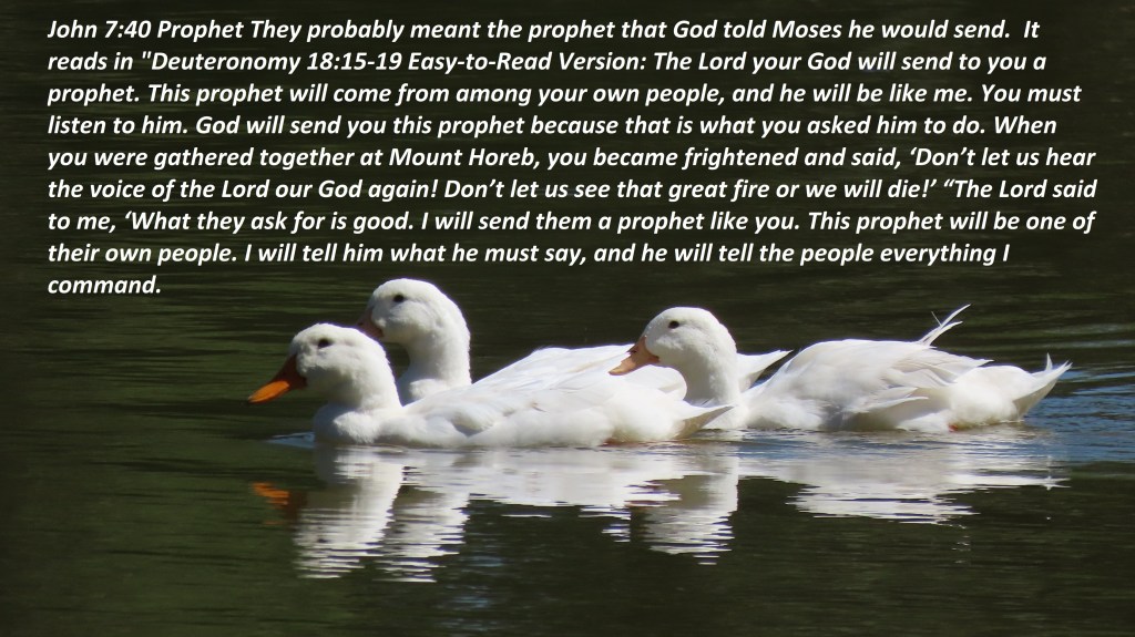 John 7:40 Prophet They probably meant the prophet that God told Moses he would send. It reads in Deuteronomy 18:15-19 Easy-to-Read Version: The Lord your God will send to you a prophet. This prophet will come from among your own people, and he will be like me. You must listen to him. God will send you this prophet because that is what you asked him to do. When you were gathered together at Mount Horeb, you became frightened and said, ‘Don’t let us hear the voice of the Lord our God again! Don’t let us see that great fire or we will die!’ “The Lord said to me, ‘What they ask for is good. I will send them a prophet like you. This prophet will be one of their own people. I will tell him what he must say, and he will tell the people everything I command. This prophet will speak for me, and I will punish anyone who refuses to listen to my commands.’ Lord You have told us the end from the beginning through many prophets who, like Moses, faithfully spoke Your Words. Jesus Who came to earth as the ultimate Prophet, Priest, and King. Jesus is the living Word, Who only spoke those things that He heard from You Lord, and Your Word, which instructs us in godly living, and provides all we need to live godly in Christ Jesus.