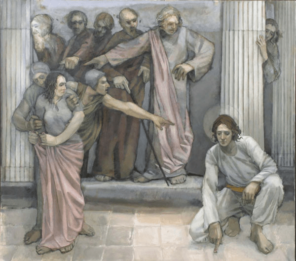 Incident: A group of scribes and Pharisees interrupts Jesus’ teaching by bringing in a woman who was caught in the act of adultery.
