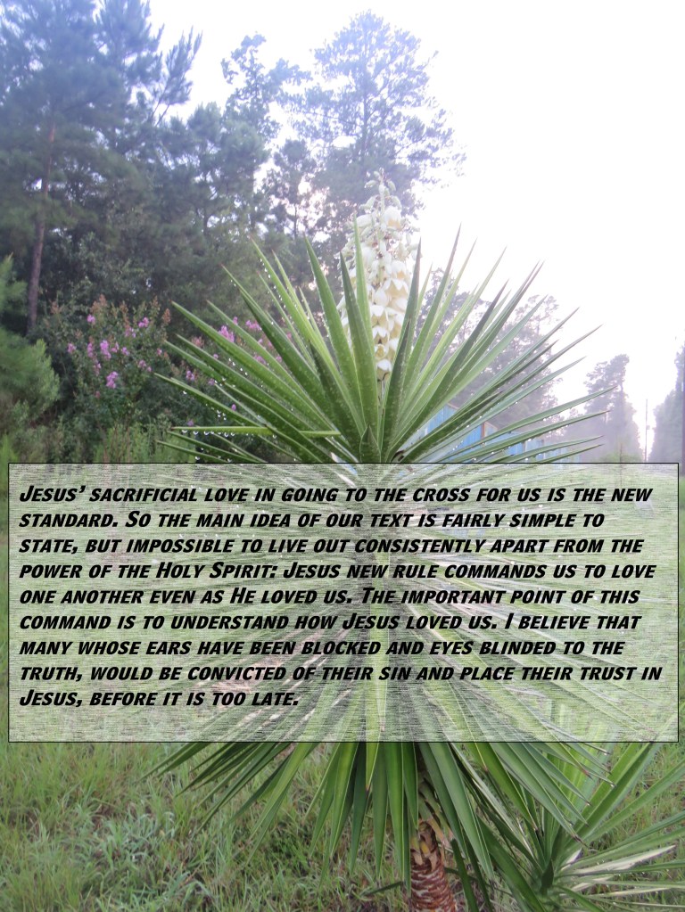 Jesus’ sacrificial love in going to the cross for us is the new standard. So, the main idea of our text is fairly simple to state, impossible to live out consistently apart from the power of the Holy Spirit: Jesus new rule commands us to love one another even as He loved us. The important point of this command is to understand how Jesus loves us. I believe that many whose ears have been blocked and eyes blinded to the truth, would be convicted of their sin and place their trust in Jesus, before it is too late.