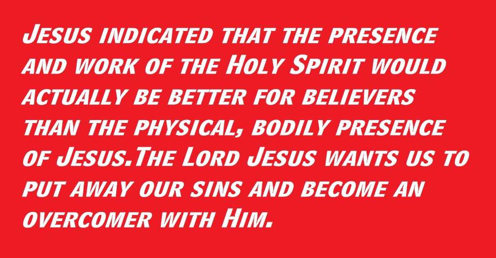Jesus indicated that the presence and work of the Holy Spirit would actually be better for believers than the physical, bodily presence of Jesus. The Lord Jesus wants us to put away our sins and become an overcomer with Him.