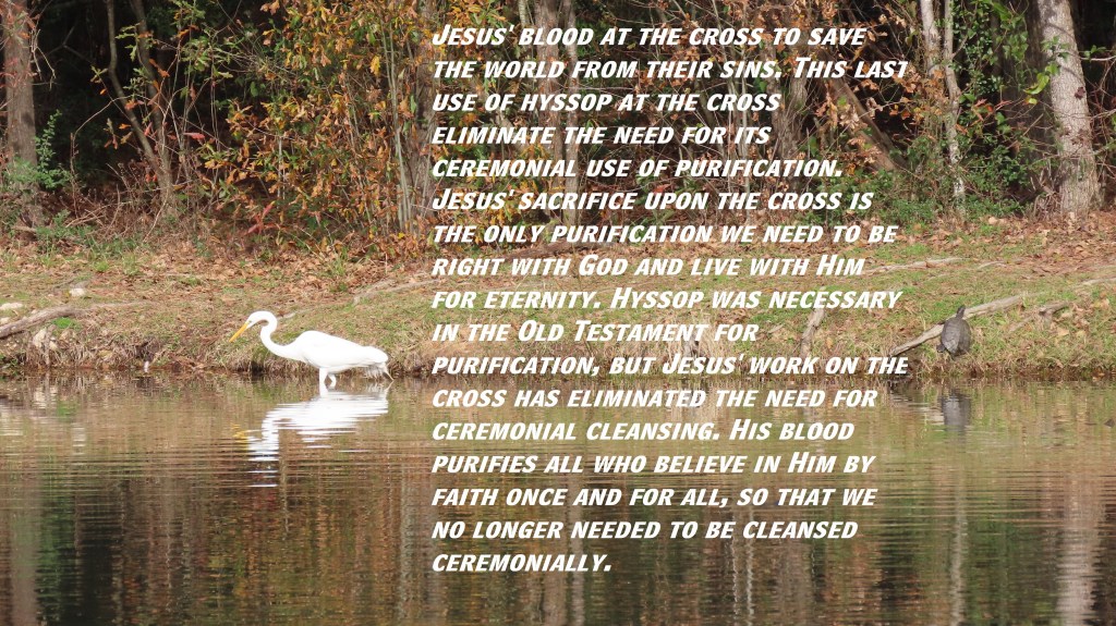 True hyssop (H. officinalis) is a plant with a long history of use in food and folk medicine. This word hyssop makes me think of biblical stories where a plant by this name was used as a cleansing herb in religious ceremonies. Some say ancient Romans used hyssop as a barrier to negativity. While the Hebrew word for hyssop, “ezob,” and the Greek “hyssopos,” were used in scripture and translated to hyssop in English, some researchers argue that H. officinalis is not the plant in question. Like the first Passover, when hyssop was used to spread the purifying blood of the lamb upon the Israelite’s doorpost, hyssop is used here as Jesus bleeds out the blood that would purify and atone for our sins for eternity. Just as hyssop aided in spreading the blood of a sacrificial life to save the Israelites at the first Passover, hyssop aided in the shedding of Jesus’ blood at the cross to save the world from their sins. This last use of hyssop at the cross eliminate the need for its ceremonial use of purification. Jesus’ sacrifice upon the cross is the only purification we need to be right with God and live with Him for eternity. Hyssop was necessary in the Old Testament for purification, but Jesus’ work on the cross has eliminated the need for ceremonial cleansing. His blood purifies all who believe in Him by faith once and for all, so that we no longer needed to be cleansed ceremonially.