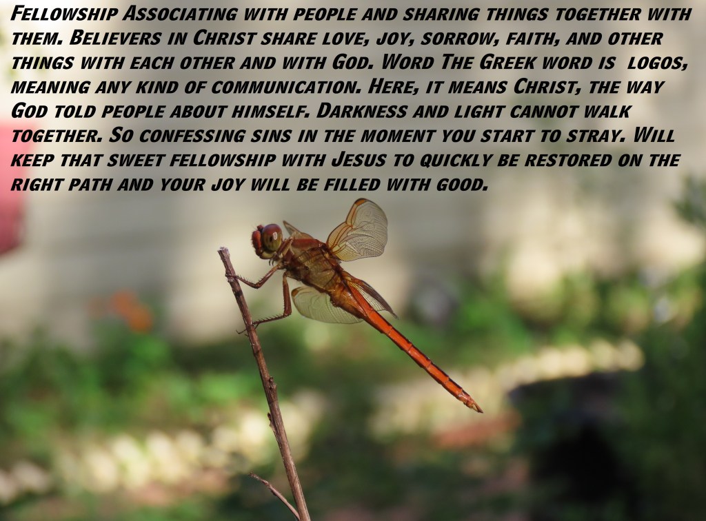 Fellowship Associating with people and sharing things together with them. Believers in Christ share love, joy, sorrow, faith, and other things with each other and with God. Word The Greek word is “ logos,” meaning any kind of communication. Here, it means Christ, the way God told people about himself. Darkness and light cannot walk together. So confessing sins in the moment you start to stray. Will keep that sweet fellowship with Jesus to quickly be restored on the right path and your joy will be filled with good.