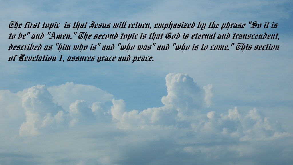 The first topic is that Jesus will return, emphasized by the phrase “So it is to be” and “Amen.” The second topic is that God is eternal and transcendent, described as “him who is” and “who was” and “who is to come.” This section of Revelation 1 assures grace and peace.