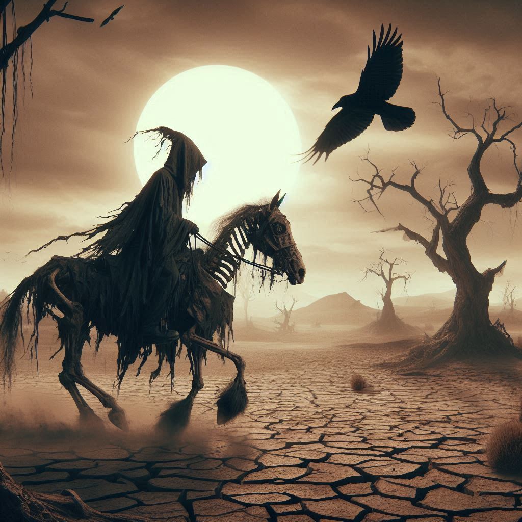 The third rider refers to one of the Four Horsemen of the Apocalypse described in the Book of Revelation in the New Testament of the Bible. The third horseman rides a black horse and symbolizes famine. He carries a pair of scales, which represents the scarcity and high cost of food during times of famine. This imagery is often interpreted as a warning of the severe hunger and economic hardship that can follow war and conflict.