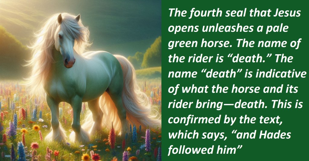 The fourth seal that Jesus opens unleashes a pale green horse. The name of the rider is “death.” The name “death” is indicative of what the horse and its rider bring, death. This is confirmed by the text, which says, “and Hades followed him”