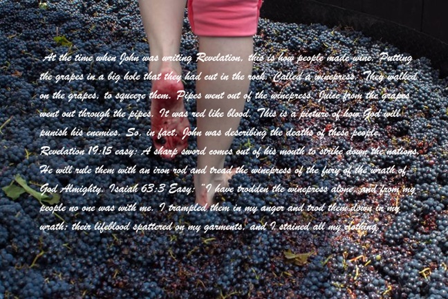 This part describes the divine judgment. In vision, the Son of Man harvests the earth, and angels participate in this harvest, representing God’s wrath by gathering clusters of grapes from the vine of the earth and throwing them into the great winepress of God’s wrath. The passage is interpreted as a warning and judgment that has not produced reformation, and the sins of the nations are filled up and become ripe for judgments. Fire destroys what the farmer does not need after the harvest. God is showing how angry he is. He is angry with everyone who will not obey him. Grapes are like a picture of bad people. At the time when John was writing Revelation, this is how people made wine. Putting the grapes in a big hole that they had cut in the rock. Called a winepress. They walked on the grapes, to squeeze them. Pipes went out of the winepress. Juice from the grapes went out through the pipes. It was red like blood. This is a picture of how God will punish his enemies. So, in fact, John was describing the deaths of these people. Revelation 19:15 easy: A sharp sword comes out of his mouth to strike down the nations. He will rule them with an iron rod and tread the winepress of the fury of the wrath of God Almighty. Isaiah 63:3 Easy: “I have trodden the winepress alone, and from my people no one was with me. I trampled them in my anger and trod them down in my wrath; their lifeblood spattered on my garments, and I stained all my clothing.