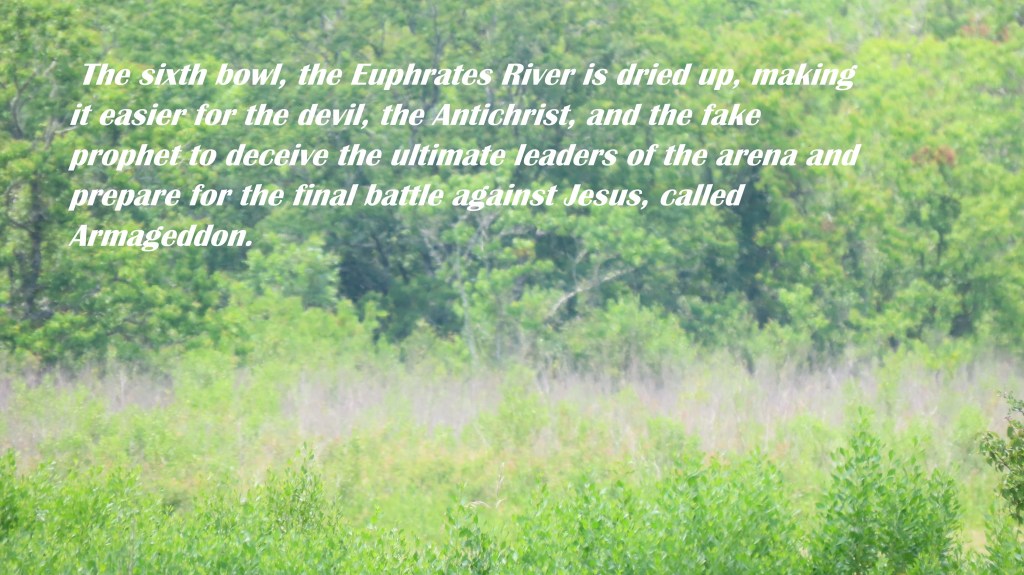 The sixth bowl, the Euphrates River is dried up, making it easier for the devil, the Antichrist, and the fake prophet to deceive the ultimate leaders of the arena and prepare for the final battle against Jesus, called Armageddon.