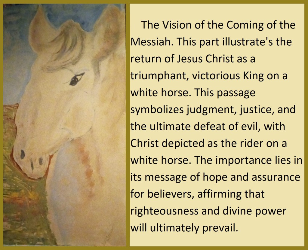 The Vision of the Coming of the Messiah. This part illustrates the return of Jesus Christ as a triumphant, victorious King on a white horse. This passage symbolizes judgment, justice, and the ultimate defeat of evil, with Christ depicted as the rider on a white horse. The importance lies in its message of hope and assurance for believers, affirming that righteousness and divine power will ultimately prevail.