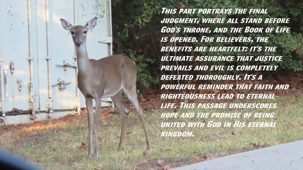 This part portrays the final judgment, where all stand before God’s throne, and the Book of Life is opened. For believers, the benefits are heartfelt: it’s the ultimate assurance that justice prevails and evil is completely defeated thoroughly. It’s a powerful reminder that faith and righteousness lead to eternal life. This passage underscores hope and the promise of being united with God in His eternal kingdom.