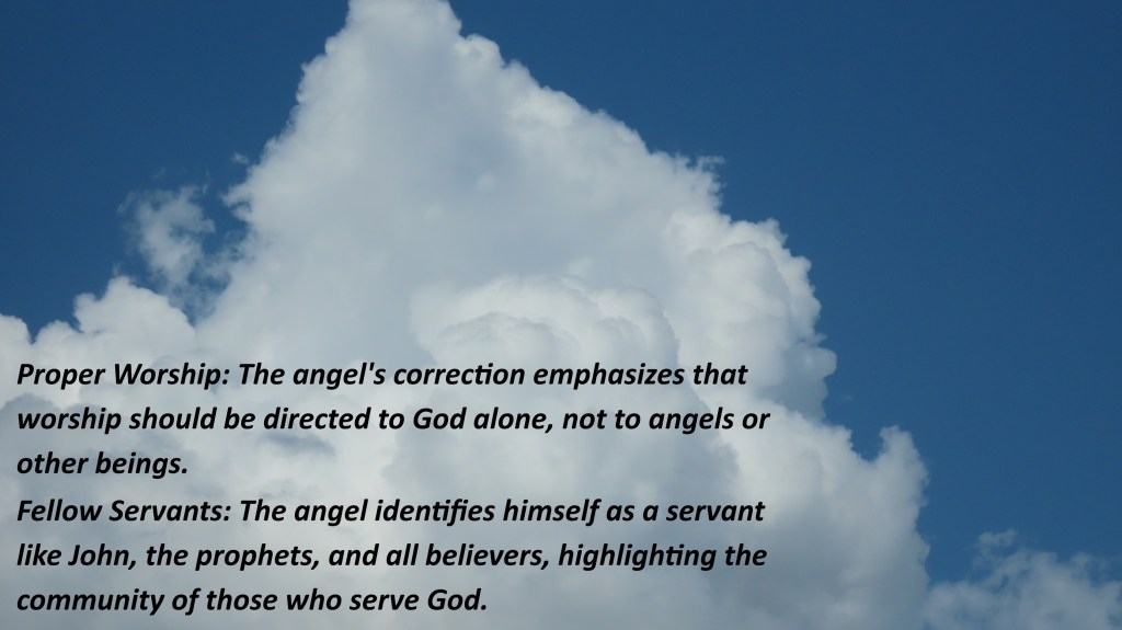 Proper Worship: The angel’s correction emphasizes that worship should be directed to God alone, not to angels or other beings.