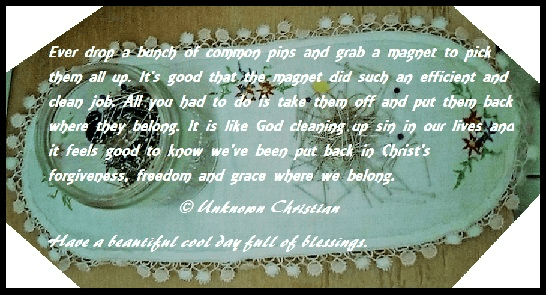Ever drop a bunch of common pins and grab a magnet to pick them all up. It’s good that the magnet did such an efficient and clean job. All you had to do is take them off and put them back where they belong. It is like God cleaning up sin in our lives and it feels good to know we’ve been put back in Christ’s forgiveness, freedom and grace where we belong.
