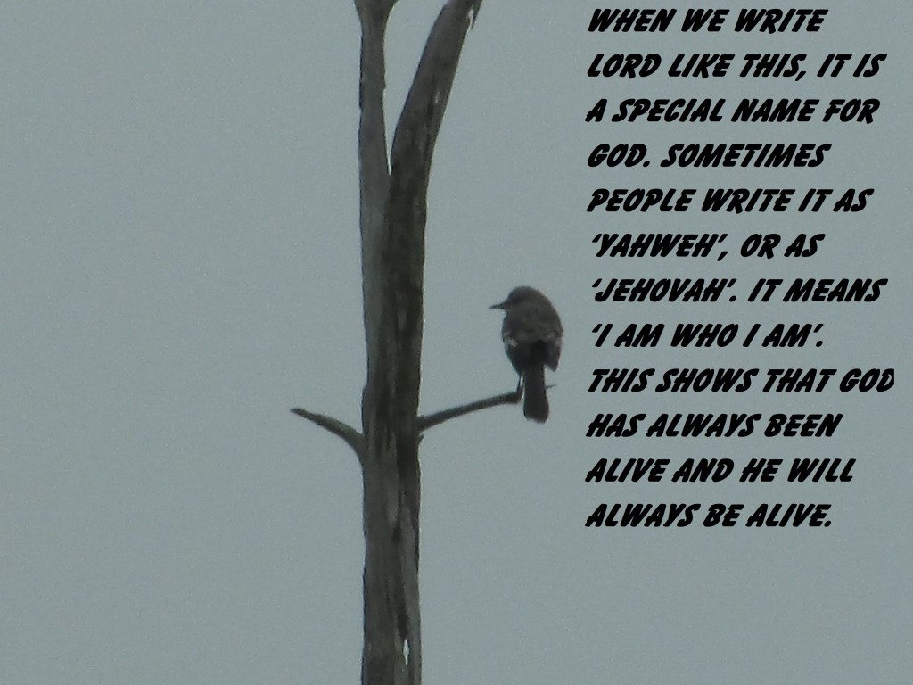(When human body meets divine spirit, soul is born. Divine breath and sculpted earth come together to make up the living soul. For thousands of years, philosophers and theologians have posed the question: what is a human being? Here God gives the answer.) When we write Lord like this, it is a special name for God. Sometimes people write it as ‘Yahweh’, or as ‘Jehovah’. It means ‘I am who I am’. This shows that God has always been alive, and he will always be alive.