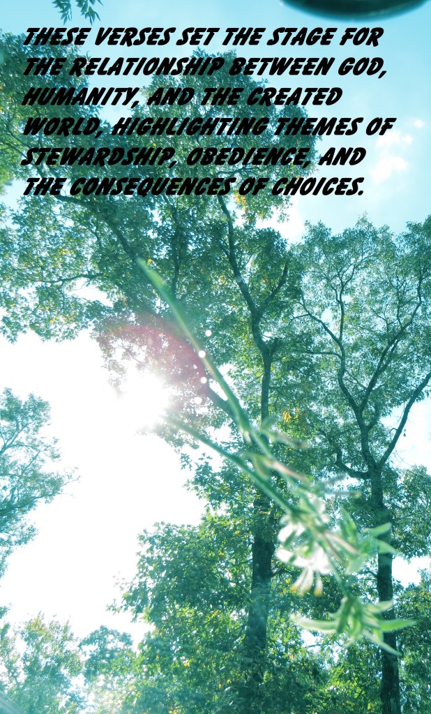 Command and Prohibition: God allows Adam to eat from any tree except the tree of the knowledge of good and evil, warning that eating from this tree would lead to death.