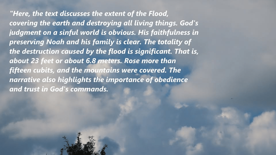 “Here, the text discusses the extent of the Flood, covering the earth and destroying all living things. God’s judgment on a sinful world is obvious. His faithfulness in preserving Noah and his family is clear. The flood caused total destruction. That is, about 23 feet or about 6.8 meters. Or rose more than fifteen cubits, and the mountains were covered. The narrative also highlights the importance of obedience and trust in God’s commands.