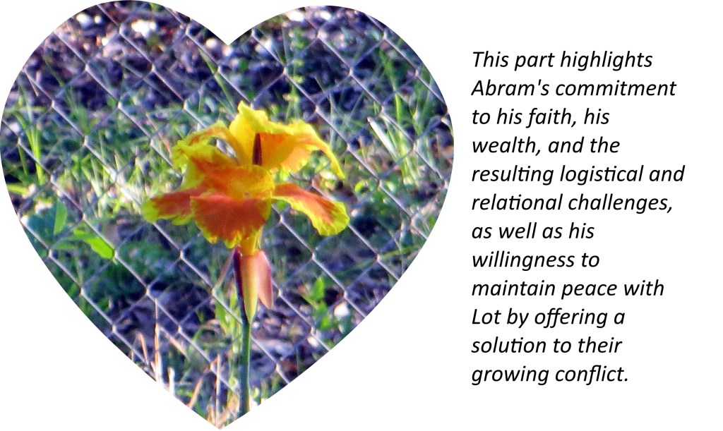 This part highlights Abram’s commitment to his faith. It also underscores his wealth and the resulting logistical and relational challenges. Additionally, it points out his willingness to keep peace with Lot by offering a solution to their growing conflict. Lot, who was traveling with Abram, also had flocks, herds, and tents. The land couldn’t support both of them while they stayed together because their possessions were so great. As a result, there was strife between the herders of Abram’s livestock and the herders of Lot’s livestock. The Canaanites and Perizzites were also living in the land at that time. So Abram said to Lot, “Let’s not have any quarreling. We are close relatives. There should be no quarreling between your herders and mine.” Isn’t the whole land before you? Let’s part company. If you choose to go to the left, I will go to the right. If you choose to go to the right, I will go to the left.” Lot looked around. He saw that the whole plain of the Jordan toward Zoar was well watered. It was like the garden of the Lord and like the land of Egypt.