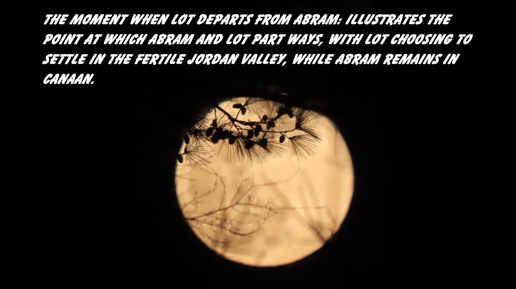 The moment when Lot departs from Abram: illustrates the point at which Abram and Lot part ways, with Lot choosing to settle in the fertile Jordan Valley, while Abram remains in Canaan.