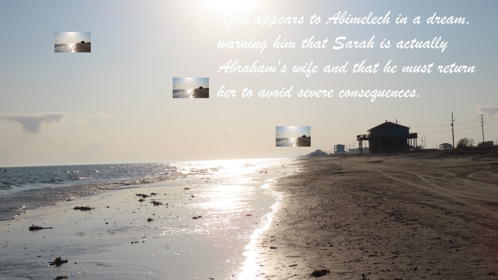 God appears to Abimelech in a dream. He warns Abimelech that Sarah is actually Abraham’s wife. Abimelech must return her to avoid severe consequences.