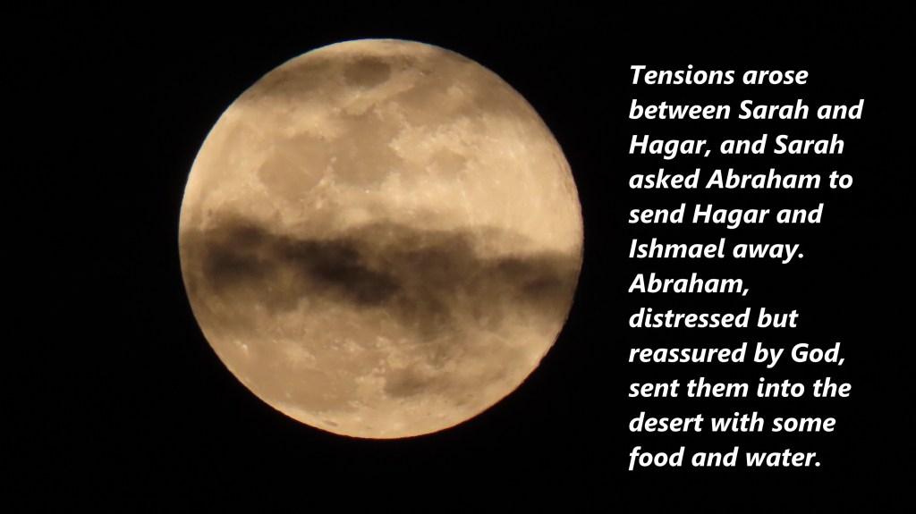 Tensions arose between Sarah and Hagar, and Sarah asked Abraham to send Hagar and Ishmael away. Abraham, distressed but reassured by God, sent them into the desert with some food and water.