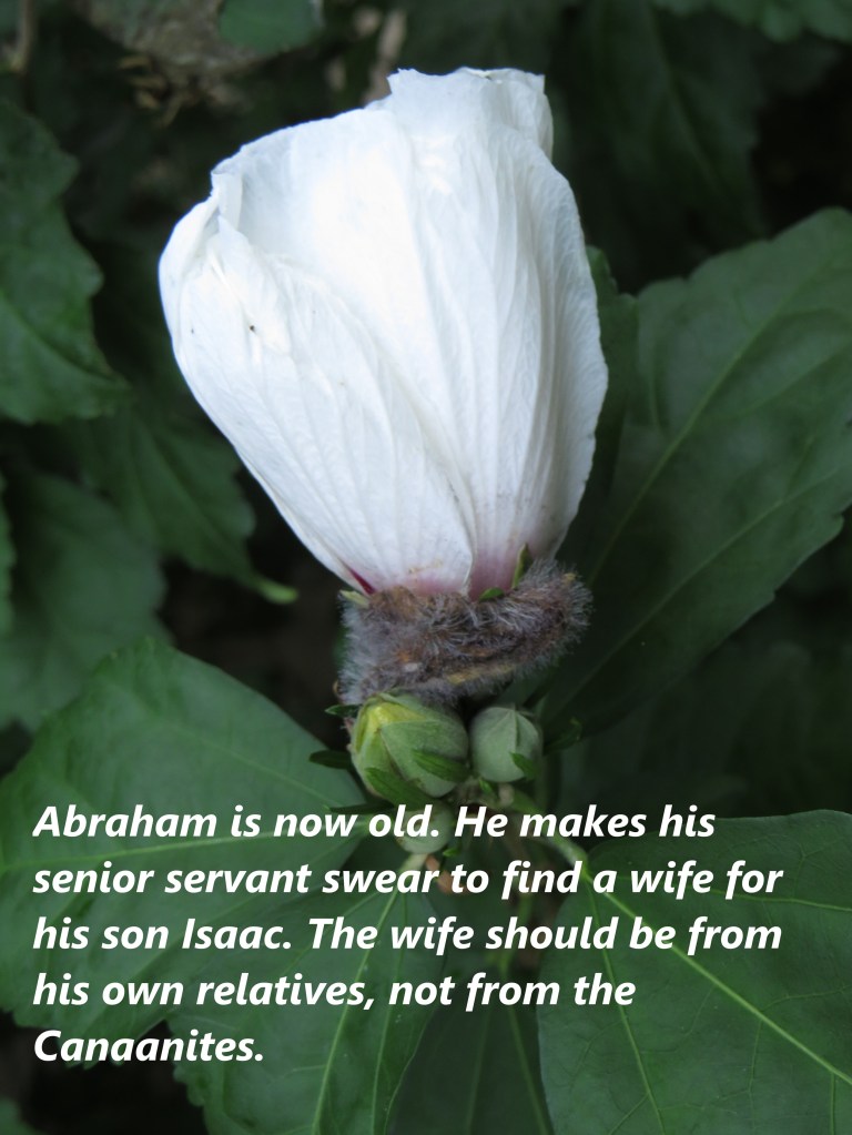 Abraham is now old. He makes his senior servant swear to find a wife for his son Isaac. The wife should be from his own relatives, not from the Canaanites.