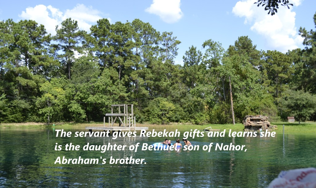 It reads in Genesis 24:21-25 Easy: Abraham’s servant watched the girl, but he did not say anything. He wanted to know if the Lord had helped him to find a wife for Isaac. The camels finished drinking. Then Abraham’s servant took out a valuable gold nose ring. It weighed one half shekel. He also took out two large gold rings for Rebekah’s arms. They weighed 10 shekels each. The servant gave them to Rebekah and he asked her, ‘Whose daughter are you? Please tell me. Is there a room in your father’s house for me and my men to sleep there tonight?’ Rebekah replied ‘I am the daughter of Bethuel. Nahor is his father, and Milcah is his mother. We have plenty of grass and food for the camels. And there is a room for you to stay with us for the night.’