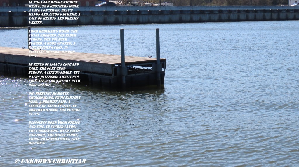 From Rebekah’s womb, the twins emerged, The elder strong, the younger surged. A bowl of stew, a birthright’s cost, In fleeting hunger, wisdom lost.
