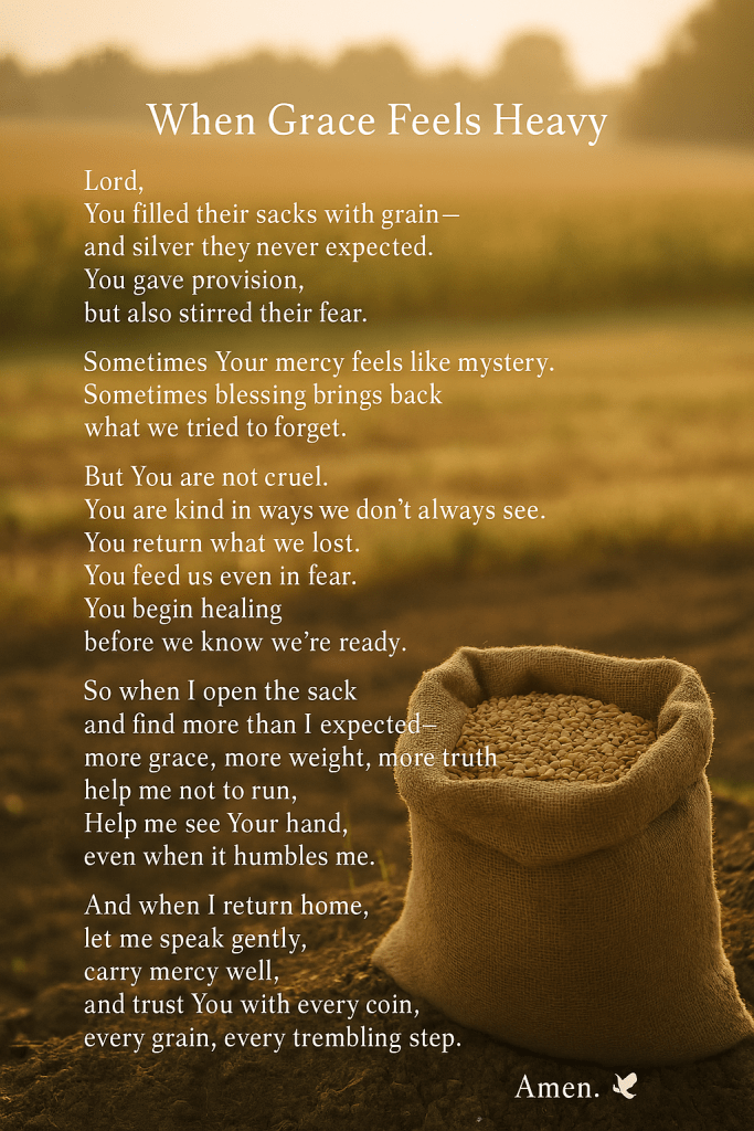 Joseph’s test deepens, and the brothers begin to feel the weight of both provision and suspicion. Joseph secretly returns the silver each brother used to buy grain, placing it back in their sacks. He also loads them with food for their journey and releases all but Simeon, who remains in custody until they return with Benjamin. When the brothers discover the silver in one of their sacks during a rest stop, they’re terrified. They say, “What is this that God has done to us?” A moment of spiritual reckoning. Joseph is testing their hearts, not just their honesty. By returning the silver, he’s creating a situation that will reveal whether they’ve changed or if they’ll abandon Simeon like they once abandoned him. The brothers are beginning to see God’s hand, not just coincidence. Their fear isn’t just about being accused of theft, it’s about guilt rising to the surface. They’re starting to connect their current troubles with their past sin. God is working through famine and fear to bring about repentance and restoration. Joseph’s actions may seem harsh, but they’re guided by wisdom and a longing for reconciliation. reminder that sometimes, grace comes wrapped in confusion. That God can use even the return of silver to stir a soul awake.