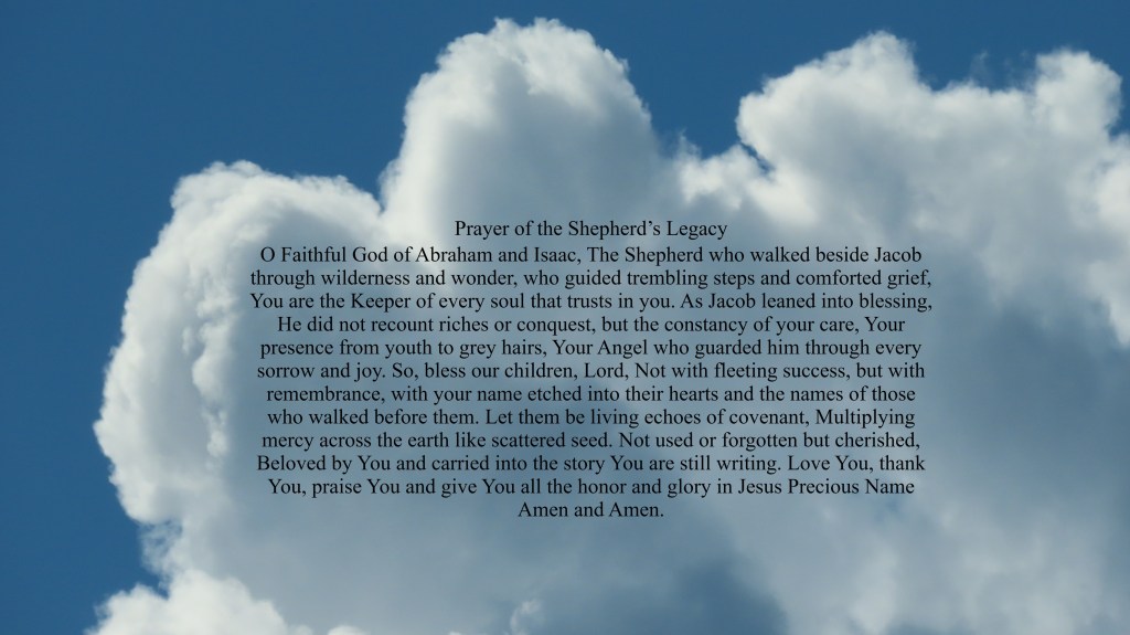 O Faithful God of Abraham and Isaac, The Shepherd who walked beside Jacob through wilderness and wonder, who guided trembling steps and comforted grief, You are the Keeper of every soul that trusts in you. As Jacob leaned into blessing, He did not recount riches or conquest, but the constancy of your care, Your presence from youth to grey hairs, Your Angel who guarded him through every sorrow and joy. So, bless our children, Lord, not with fleeting success, but with remembrance, with your name etched into their hearts and the names of those who walked before them. Let them be living echoes of covenant, multiplying mercy across the earth like scattered seed. Not used or forgotten but cherished, Beloved by You and carried into the story You are still writing. Love You, thank You, praise You and give You all the honor and glory in Jesus Precious Name Amen and Amen.