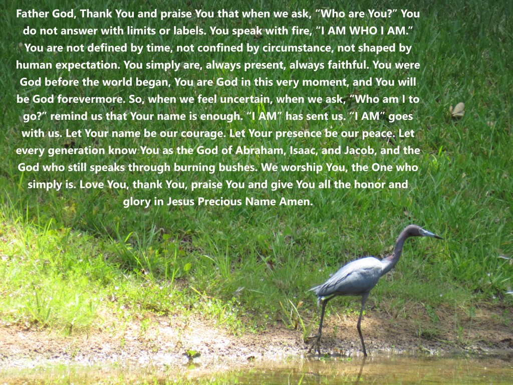 Father God, Thank You and praise You that when we ask, “Who are You?” You do not answer with limits or labels. You speak with fire, “I AM WHO I AM.” You are not defined by time, not confined by circumstance, not shaped by human expectation. You simply are, always present, always faithful. You were God before the world began, You are God in this very moment, and You will be God forevermore. So, when we feel uncertain, when we ask, “Who am I to go?” remind us that Your name is enough. “I AM” has sent us. “I AM” goes with us. Let Your name be our courage. Let Your presence be our peace. Let every generation know You as the God of Abraham, Isaac, and Jacob, and the God who still speaks through burning bushes. We worship You, the One who simply is. Love You, thank You, praise You and give You all the honor and glory in Jesus Precious Name Amen.
