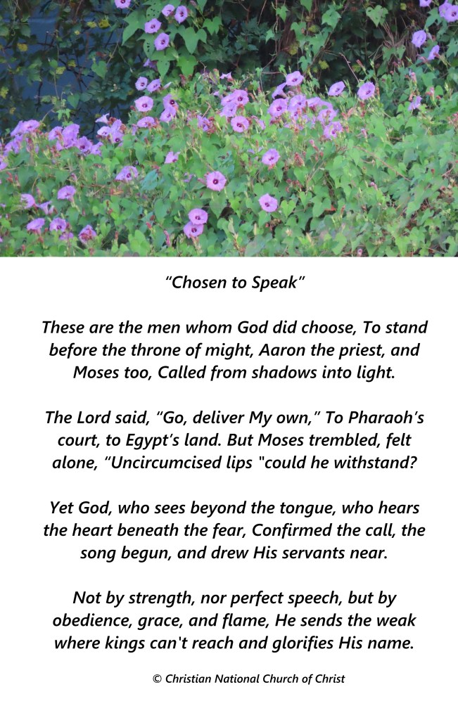 The Lord said, “Go, deliver My own,” To Pharaoh’s court, to Egypt’s land. But Moses trembled, felt alone, “Uncircumcised lips “could he withstand?