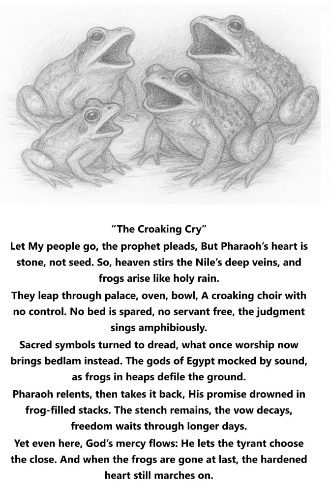 Let My people go, the prophet pleads, But Pharaoh’s heart is stone, not seed. So, heaven stirs the Nile’s deep veins, and frogs arise like holy rain.