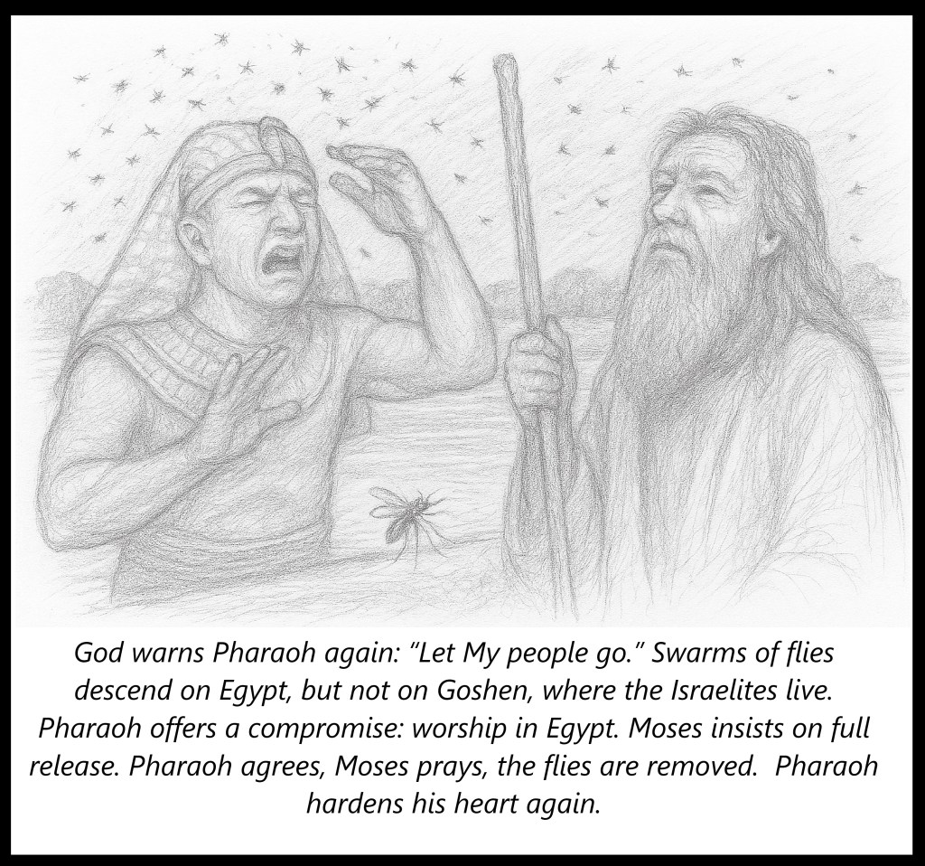 God warns Pharaoh again: “Let My people go.” Swarms of flies descend on Egypt, but not on Goshen, where the Israelites live. Pharaoh offers a compromise: worship in Egypt. Moses insists on full release. Pharaoh agrees, Moses prays, the flies are removed. Pharaoh hardens his heart again.