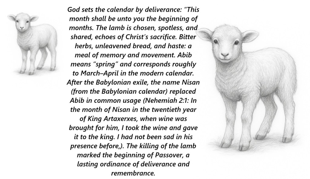 God sets the calendar by deliverance: “This month shall be unto you the beginning of months. The lamb is chosen, spotless, and shared, echoes of Christ’s sacrifice. Bitter herbs, unleavened bread, and haste: a meal of memory and movement. Abib means “spring” and corresponds roughly to March–April in the modern calendar. After the Babylonian exile, the name Nisan (from the Babylonian calendar) replaced Abib in common usage (Nehemiah 2:1: In the month of Nisan in the twentieth year of King Artaxerxes, when wine was brought for him, I took the wine and gave it to the king. I had not been sad in his presence before,). The killing of the lamb marked the beginning of Passover, a lasting ordinance of deliverance and remembrance.