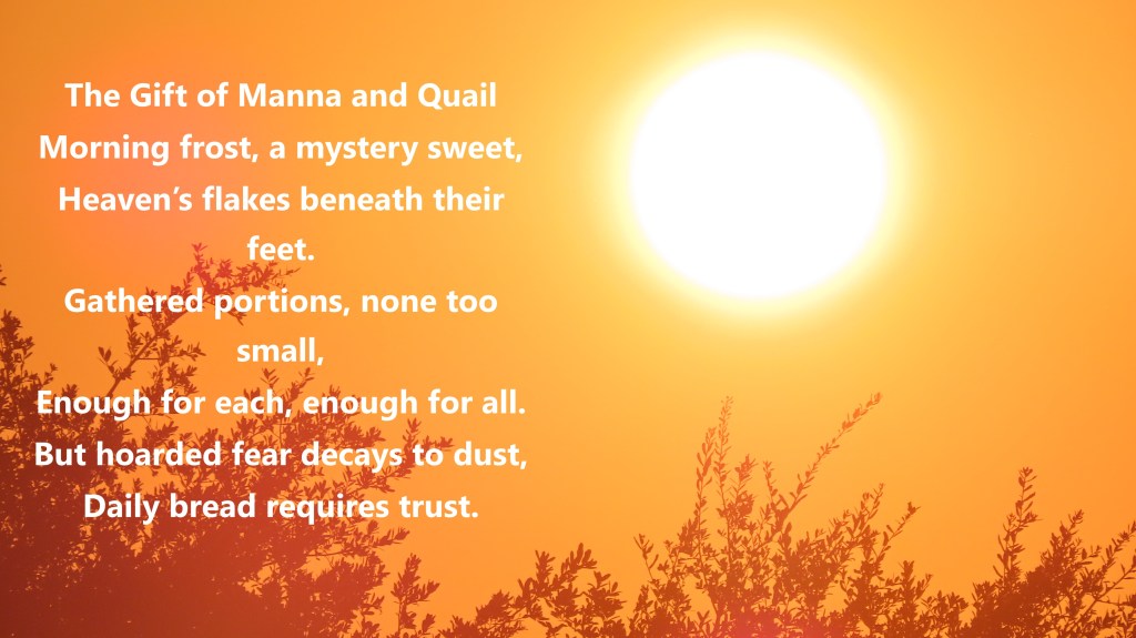 Father God, I praise You for the Manna given freely and thank You that Jesus came to earth and turned my disobedience into sweetness and saved me by grace through faith in Him. Keep me low at the Cross and broken before You. This I ask in Jesus Precious Name, Amen.
