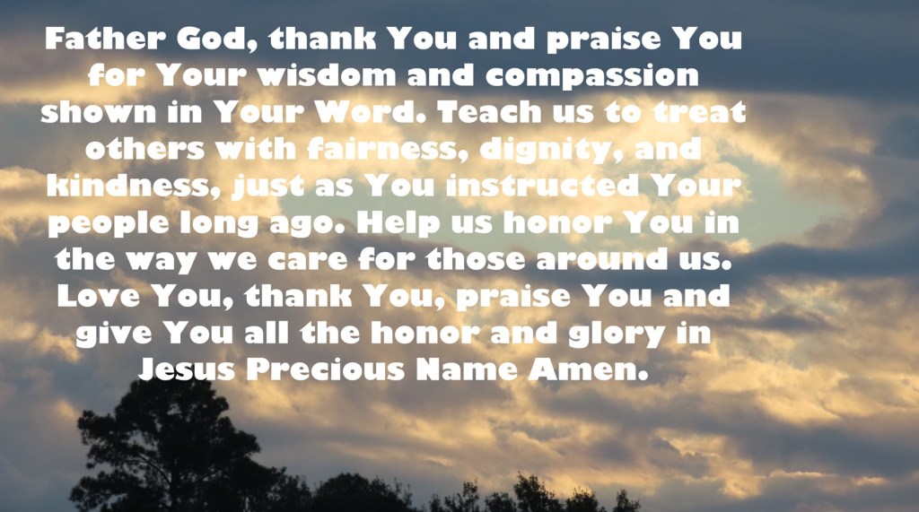 Father God, thank You and praise You for Your wisdom and compassion shown in Your Word. Teach us to treat others with fairness, dignity, and kindness, just as You instructed Your people long ago. Help us honor You in the way we care for those around us. Love You, thank You, praise You and give You all the honor and glory in Jesus Precious Name Amen.
