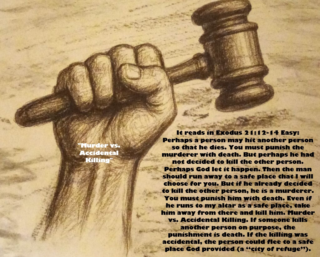 It reads in Exodus 21:12-14 Easy: Perhaps a person may hit another person so that he dies. You must punish the murderer with death. But perhaps he had not decided to kill the other person. Perhaps God let it happen. Then the man should run away to a safe place that I will choose for you. But if he already decided to kill the other person, he is a murderer. You must punish him with death. Even if he runs to my altar as a safe place, take him away from there and kill him. Murder vs. Accidental Killing. If someone kills another person on purpose, the punishment is death. If the killing was accidental, the person could flee to a safe place God provided (a “city of refuge”).