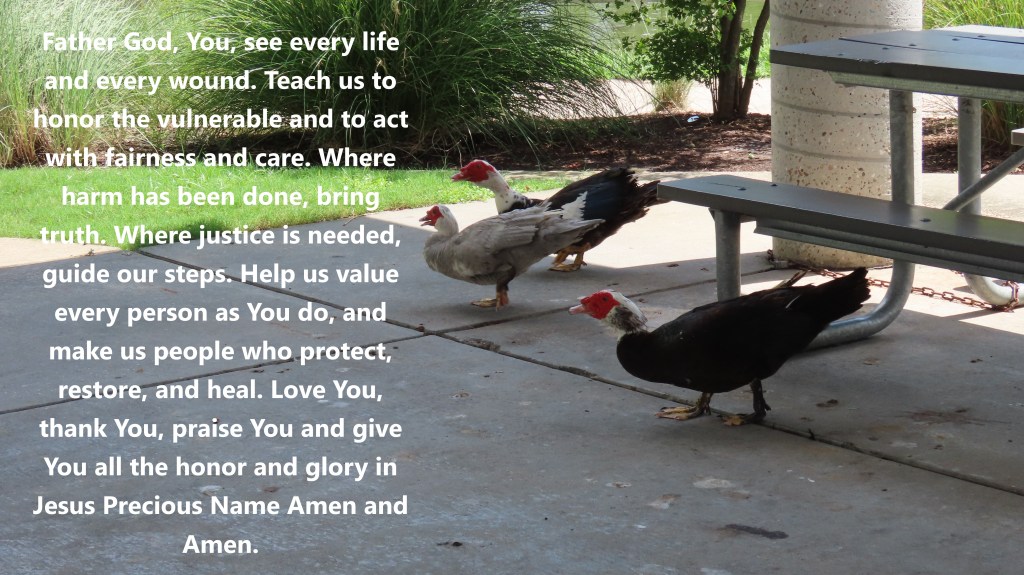 Father God, You, see every life and every wound. Teach us to honor the vulnerable and to act with fairness and care. Where harm has been done, bring truth. Where justice is needed, guide our steps. Help us value every person as You do, and make us people who protect, restore, and heal. Love You, thank You, praise You and give You all the honor and glory in Jesus Precious Name Amen and Amen.