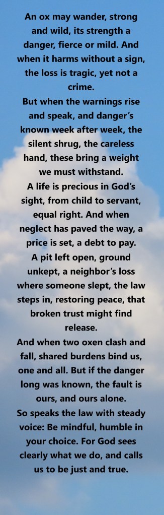 A pit left open, ground unkept, a neighbor’s loss where someone slept, the law steps in, restoring peace, that broken trust might find release.