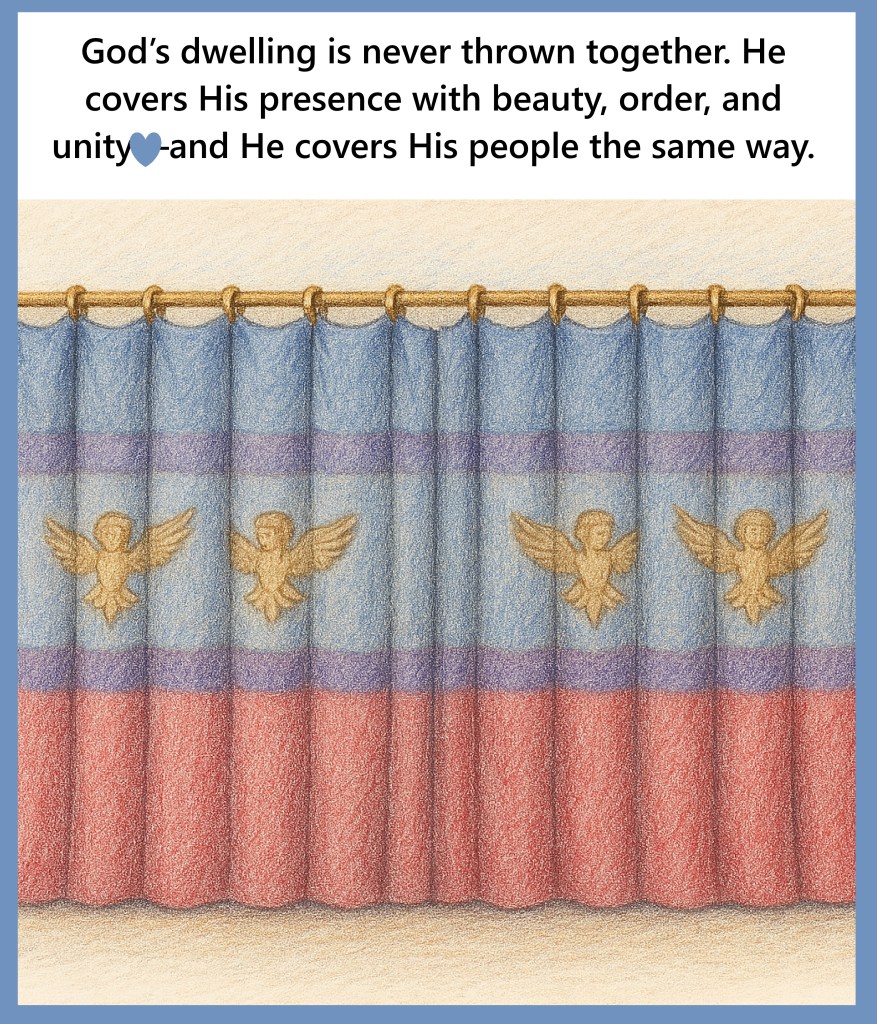 Father God, Thank You and praise You that You cover Your dwelling with beauty, unity, and holiness. As You joined each curtain together into one perfect covering, join my heart to Your will today. Let Your presence rest over my home, my thoughts, and my steps. Clothe me in Your peace, surround me with Your order, and remind me that I am held under the shelter of Your Honor and glory. Love You in Jesus Precious Name Amen.