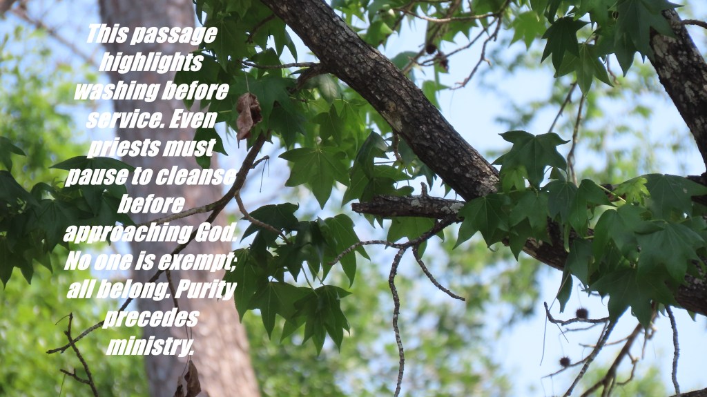 This passage highlights washing before service. Even priests must pause to cleanse before approaching God. No one is exempt; all belong. Purity precedes ministry.